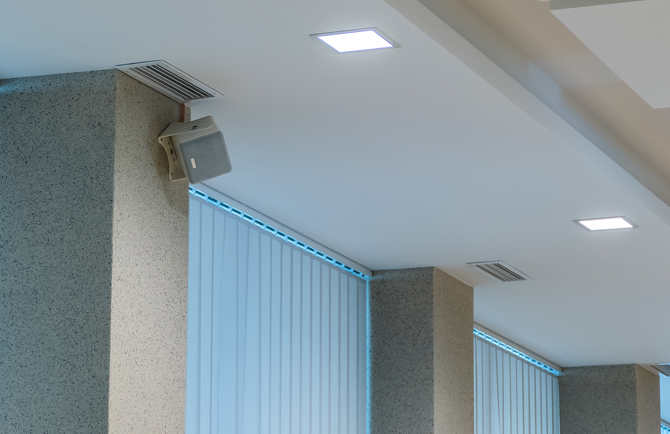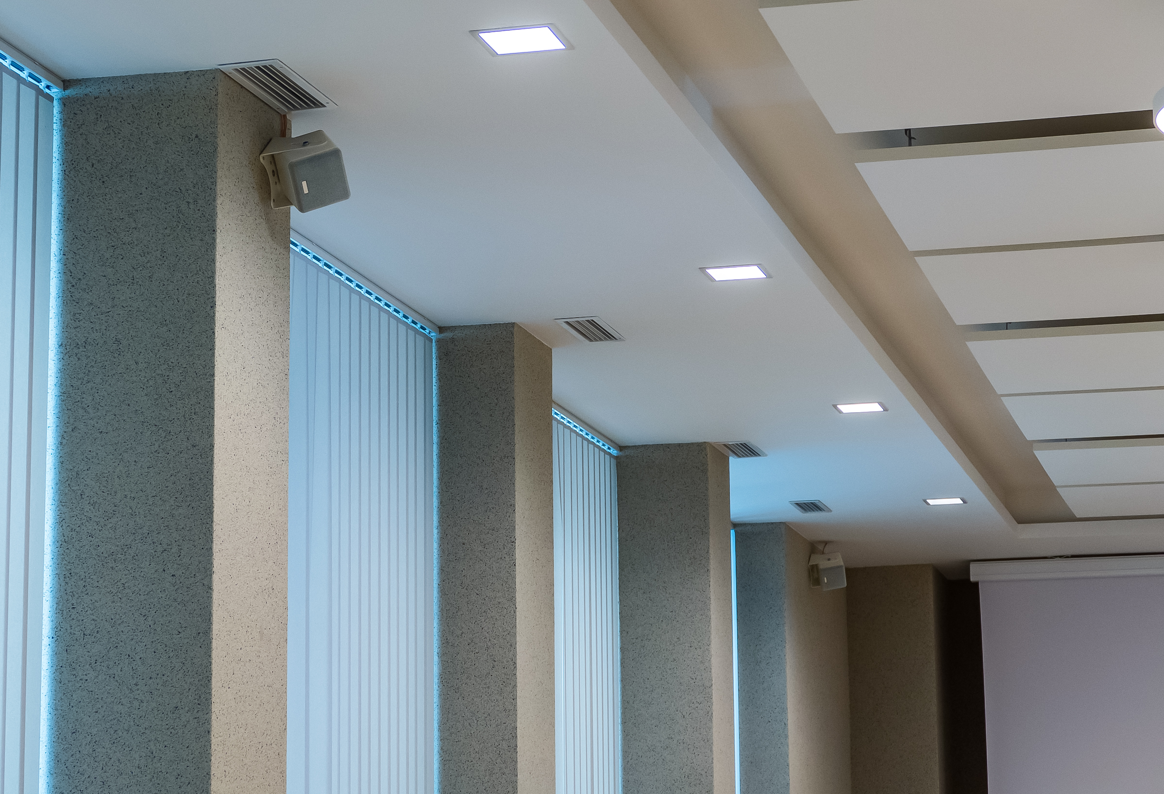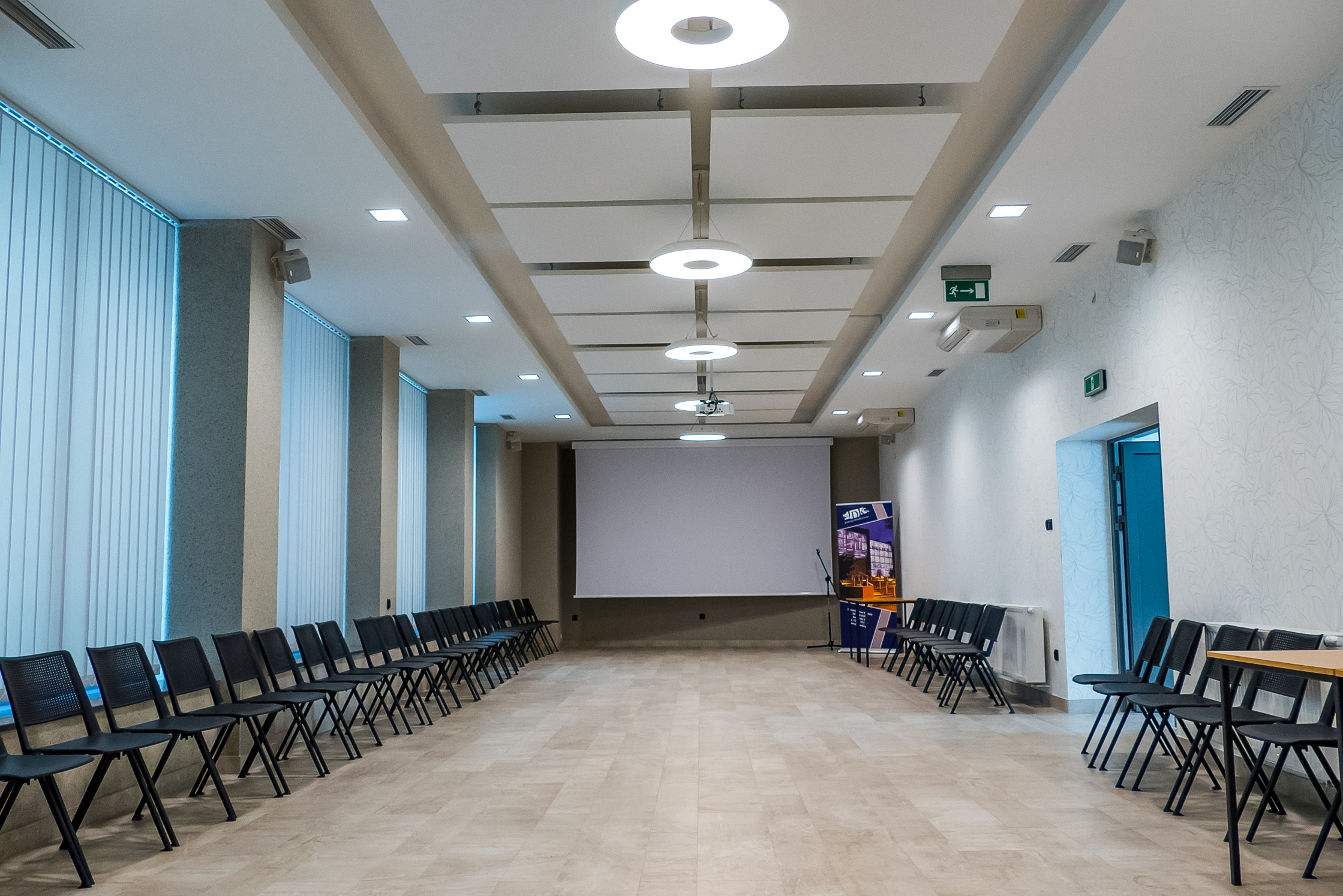 Uzupełnieniem tej realizacji jest sala multimedialna, do której dostarczyliśmy i zamontowaliśmy głośniki SEEBURG i5. To kompaktowe zestawy głośnikowe, które bardzo dobrze sprawdzają się w przestrzeniach wymagających dyskretnej obecności systemu nagłośnienia, a jednocześnie wysokiej zrozumiałości mowy i równomiernego pokrycia.